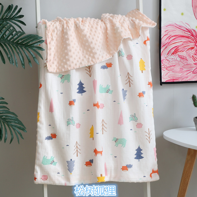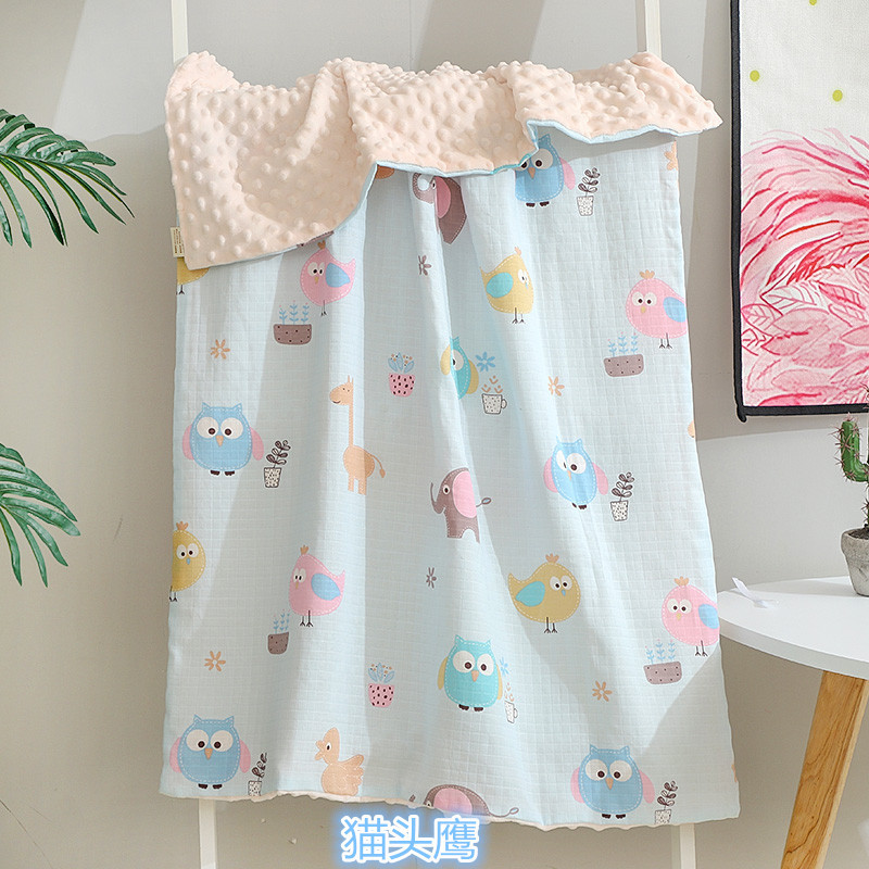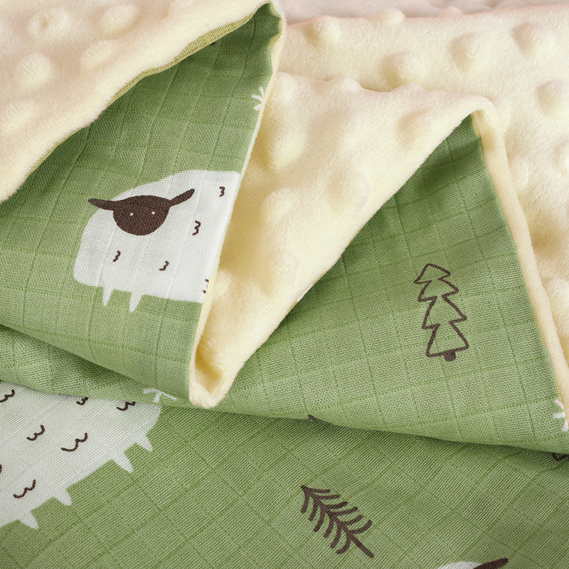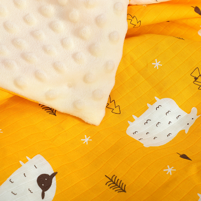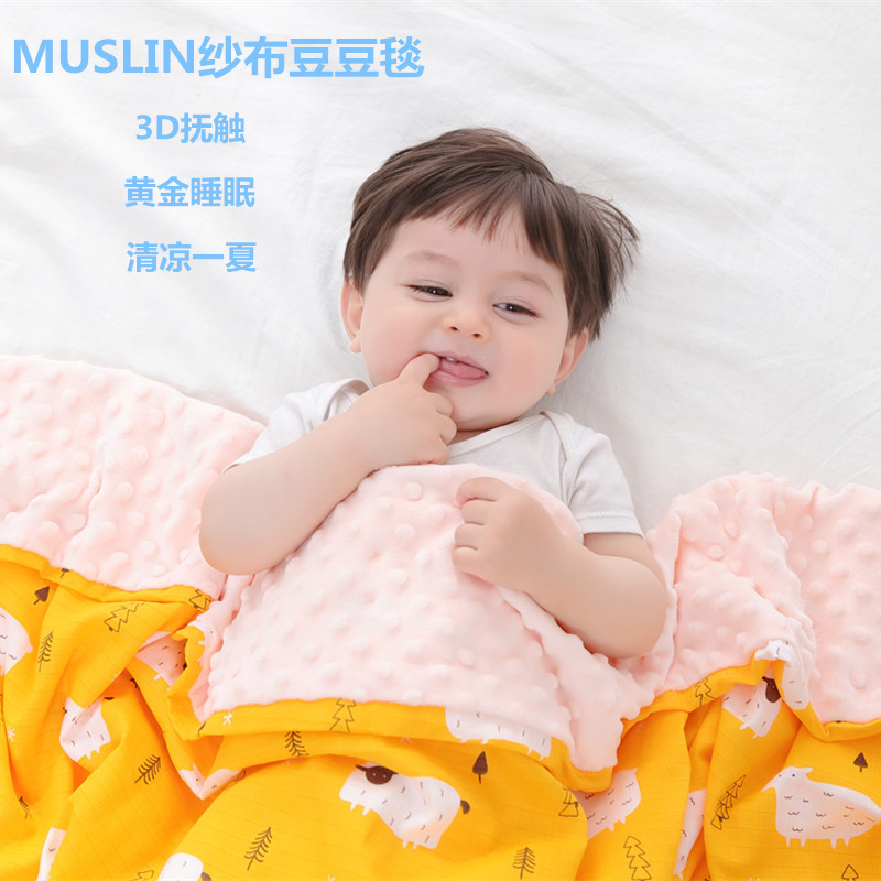 The 3D bubble pressing process is used to give the baby a numb and caressing feeling. The surface of the bean blanket is made of MUSLIN double-layer gauze and the inner layer is made of polyester fiber. The inner layer is made of material to isolate cold air, and the surface gauze is breathable and not stuffy, allowing the baby to sleep comfortably.
